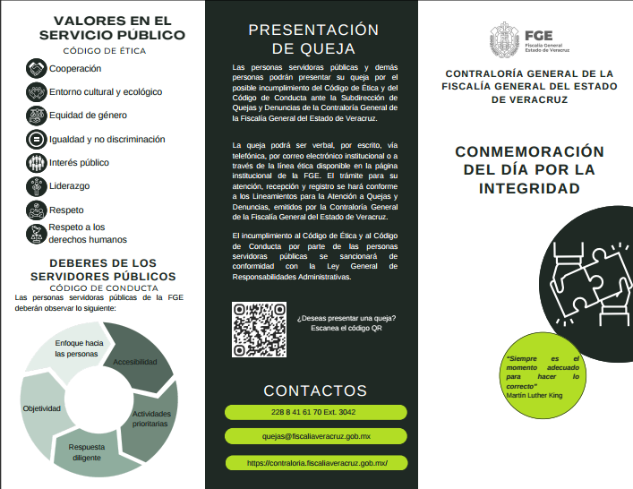 El “Día por la Integridad” es un mecanismo que busca visibilizar la importancia de la Integridad en los servidores públicos. En la Contraloría General de la Fiscalía General del Estado de Veracruz, se busca promover la transparencia, la ética y la honestidad para combatir la corrupción.